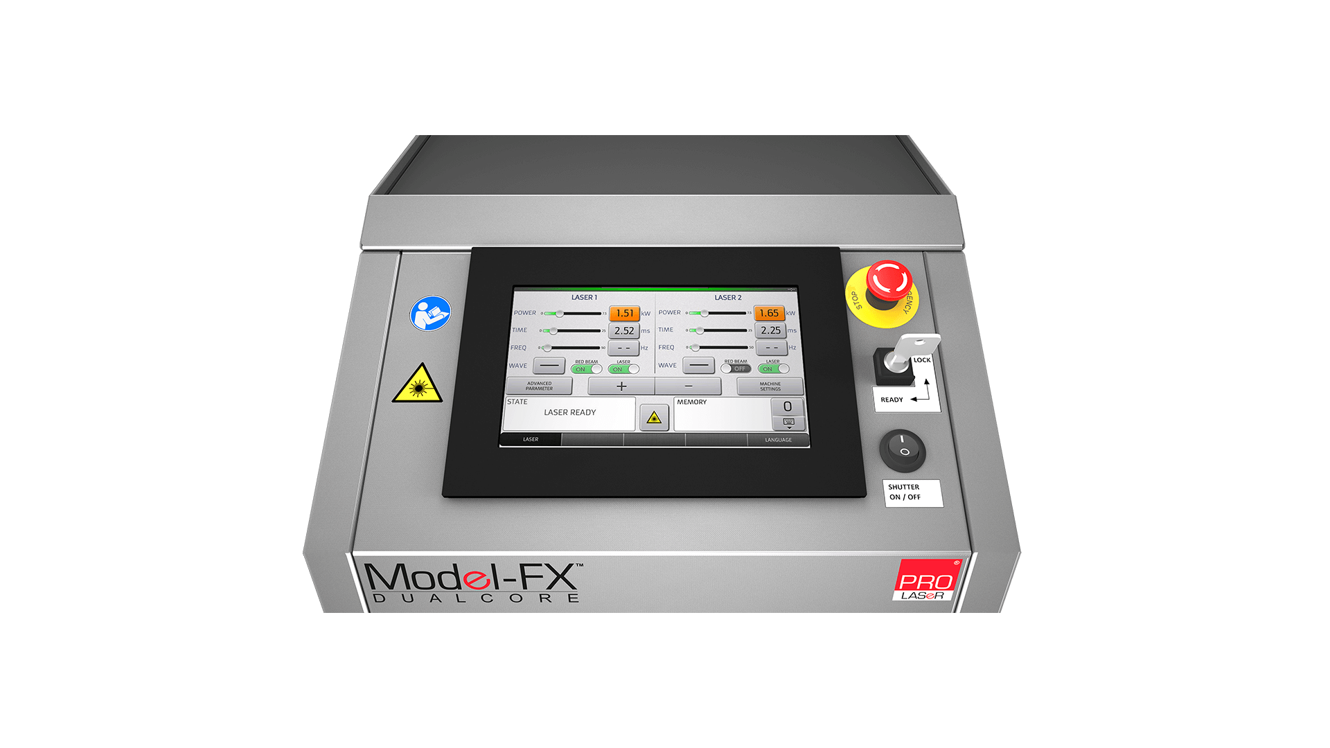 مدل-FX مجهز به یک صفحه نمایش لمسی بزرگ 7 اینچی LCD با کیفیت HD است که امکان خواندن و تنظیم پارامترها را در کمال راحتی فراهم میکند. در نسخه DualCore، صفحه نمایش بزرگ به اپراتور اجازه میدهد پارامترهای کاری هر دو لیزر را همزمان مشاهده و تنظیم کند.